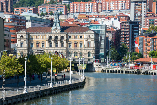 Ría y edificio del ayuntamiento de Bilbao en el País Vasco, España