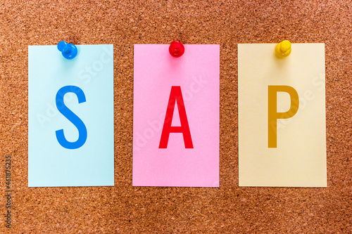 Conceptual 3 letter acronym abbreviation SAP(systems applications product, or System Application Programming) on multicolored stickers attached to a cork board.