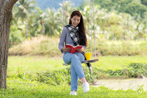 Lifestyle people girl reading book and drinking coffee for education outdoor garden at home. Young asian woman sitting swing chill and resting in summer vacations.