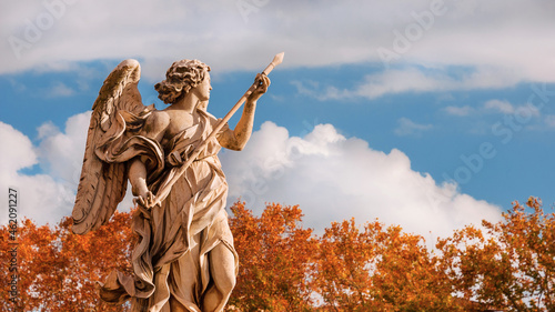 Autumn in Rome. Beautiful angel statue with Holy Lance of Longinus at the top of Sant'Angelo Bridge, erected in the 17th century, with atumnal leaves in the background
