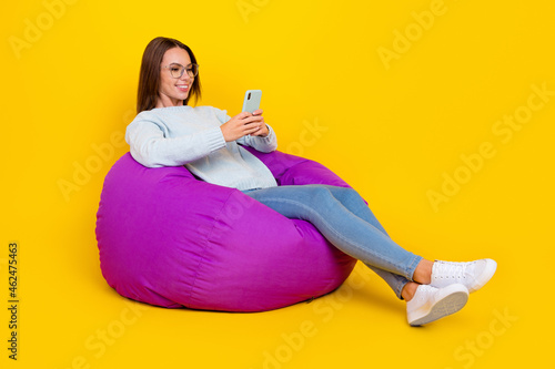 Full size photo of happy woman enjoy sit chair hold phone good mood isolated on yellow color background
