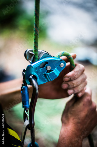 Man's hands operating a rock climbing belaying device