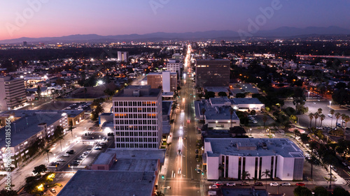 Twilight skyline view of the urban core of downtown Santa Ana, California, USA.