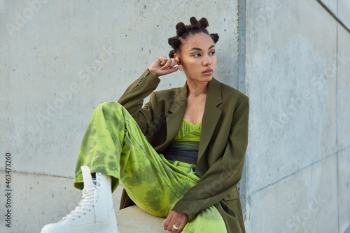 Horizontal shot of beautiful teenage girl with trendy hairstyle dressed in green clothes looks away poses against urban grey wall considers something. People youth lifestyle and fashion concept