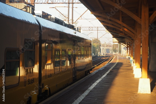 Odjeżdżający pociąg z peronu na dworcu kolejowym we Wrocławiu, Polska