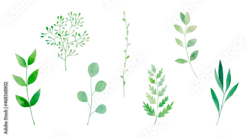 Botanical set of green herbs and leaves: fern, eucalyptus, weeping willow, nagi on white background. Isolated floral clipart of branches for wedding, cards, invitations and packages.