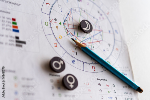 Primer plano de carta astral, símbolos astrológicos, Luna, Venus y Marte. Horóscopo y predicciones. Astrología. Sinastría y parejas.