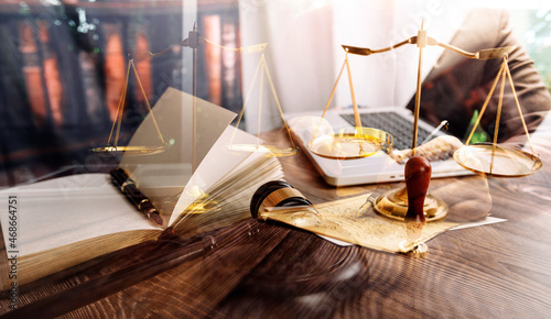 Justice and law concept.Male judge in a courtroom with the gavel, working with, computer and docking keyboard, eyeglasses, on table in morning light