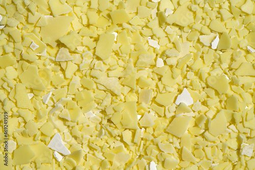Closeup chemical ingredient on laboratory table (Top View). Sodium sulfide flakes, a yellow appearance owing to the presence of polysulfides. Science background.