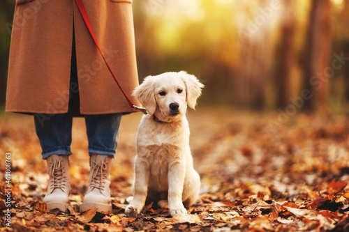Cute adorable white golden retriever puppy sitting near female legs during walk in autumn forest