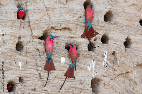 Southern carmine bee-eaters (Merops nubicoides) (formerly carmine bee-eater), nesting in the bank of the Luangwa River, South Luangwa NP, Zambia, Africa.