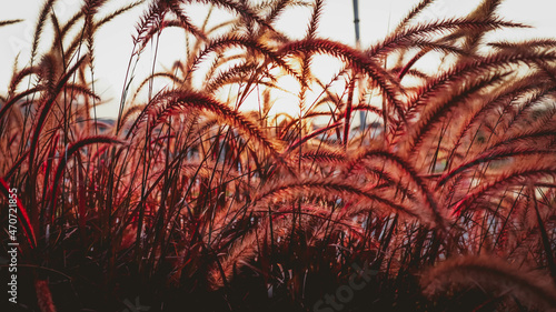 Bliski widok szkarłatnych roślin z widokiem na przebłysk złocistego światła oznaczającego zachód