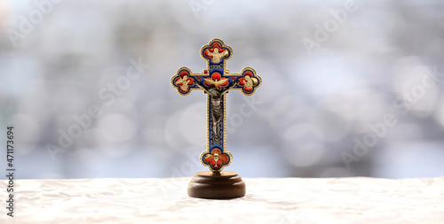 A beautiful light image of a detailed Christ on a Crucifix ornament. Located in the exact center of lightly patterned satin sheet with a plain heavily blurred bokeh background representing heaven.