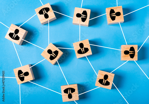 Networking, social media, SNS, internet communication line. Small network connected to a larger network. wooden block with people icon on blue background.