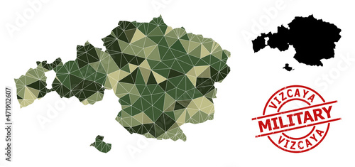 Lowpoly mosaic map of Vizcaya Province, and unclean military stamp imitation. Lowpoly map of Vizcaya Province combined with scattered khaki colored triangles.