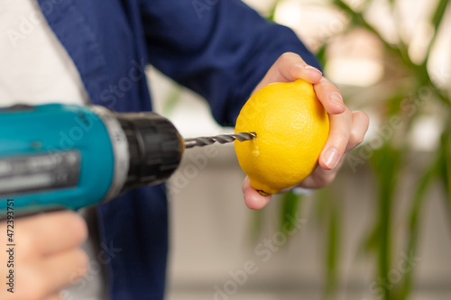 Female hands in a blue shirt hold a screwdriver with a drill and a bright lemon against the background of a light window and green leaves of a houseplant. Selective focus. Concept photo