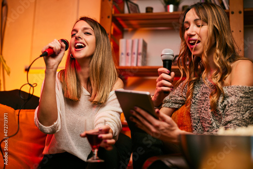 Two female friends sit at home on Saturday night and sing a duet on karaoke night.