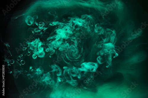 Green smoke on black ink background, colorful fog, abstract swirling emerald ocean sea, acrylic paint pigment underwater