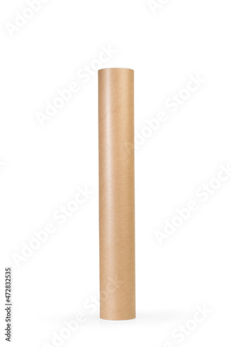 Tubo de cartón sobre un fondo blanco liso y aislado. Vista de frente. Copy space