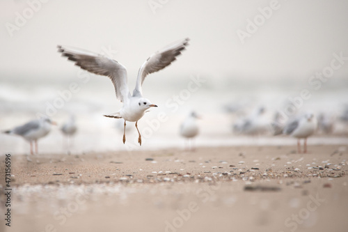 Mewa śmieszka na piaszczystej morskiej plaży.
