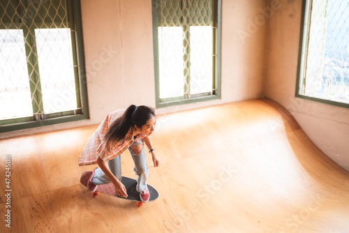 #98427962Home workout. Young healthy happy self aware confident woman practicing sport training at home in her apartment, stretching muscles and breeding exercise for better life and success.