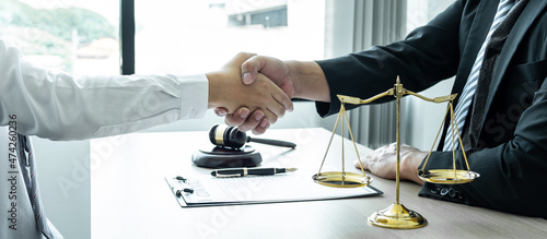 Male lawyer shaking hands with client after good deal negotiation cooperation meeting in courtroom
