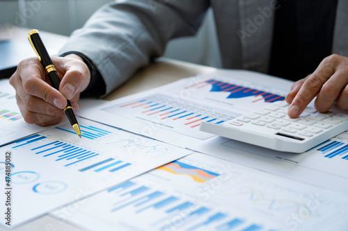 Close up of businessman or accountant hand holding pen using calculator to calculate numbers with business chart data. Accountancy documents and business information on the desk at the office,