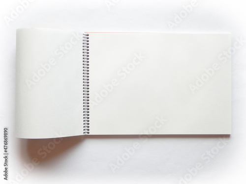 開いたスケッチブックの白い画用紙のコピースペース。真上からの撮影。