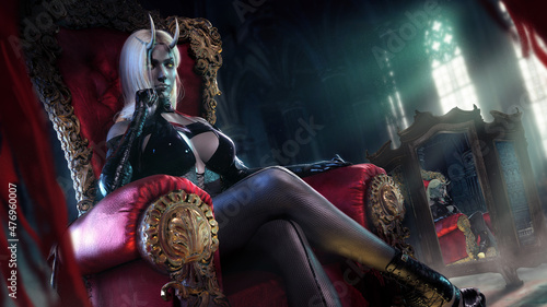 An elegant narcissistic horned demoness with dark skin in a tight-fitting leather suit sits impressively in a red armchair in shade in the middle of old temple, playfully looking away. 3d rendering