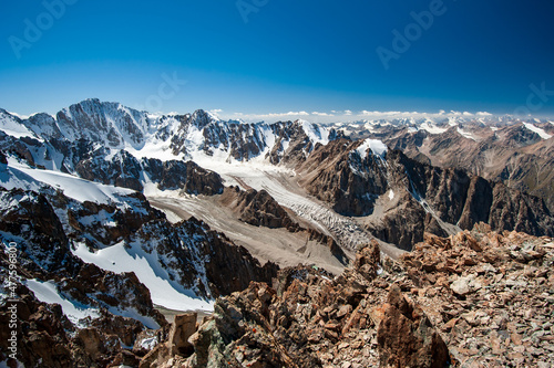 View from the top of Pik Uchitel peak with cross. Ala Archa Alpine National Park Landscape near Bishkek, Tian Shan Mountain Range, Kyrgyzstan, Central Asia.