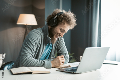 Young Student has an Online Video Lecture Uses a Laptop and Headphones, Takes Notes in a Notebook. Curly-Haired Guy sits in Earphones at the Table in his Office. Close-up