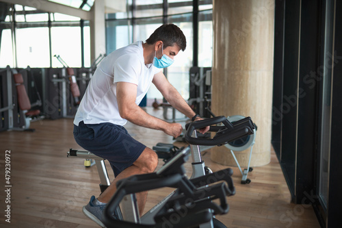 Man exercising in the gym on stationary bike indoor cycling wearing face mask to prevent coronavirus