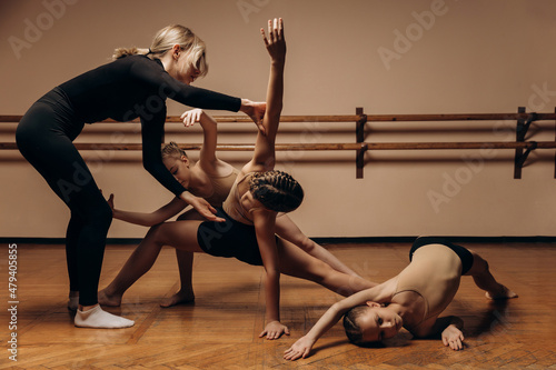 group of little girls at a group training session in a dance studio watch as they learn a new dance with a choreographer