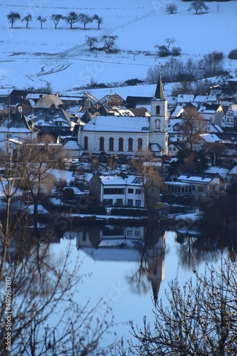 reflektierte Kirche und Höuser im Schalkenmehrener Maar