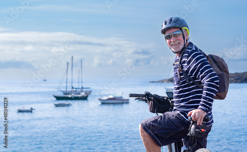 Smiling adult mature senior cyclist man wearing sunglasses, backpack and sport helmet riding in front of the sea enjoying outdoors, freedom, healthy lifestyle. Happy active elderly during retirement