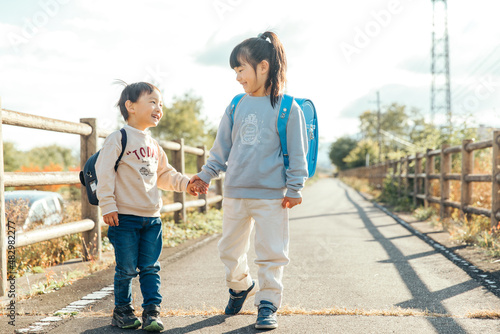 手を繋いで笑顔をみせる子供 Innocent