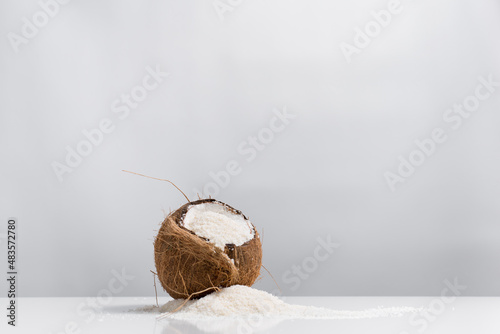 Coco abierto con hojuelas de coco ralladas que se derraman sobre una mesa blanca