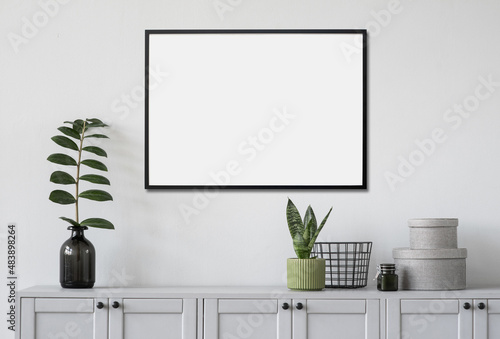 Blank picture frame mockup on white wall. Template for painting or poster. White living room interior design. View of modern rustic style interior with artwork mock-up