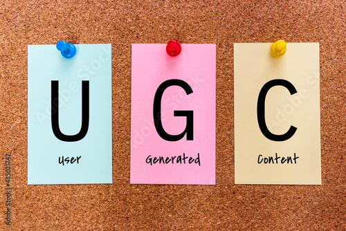 Conceptual 3 letters keyword UGC (User Generated Content) on multicolored stickers attached to a cork board.