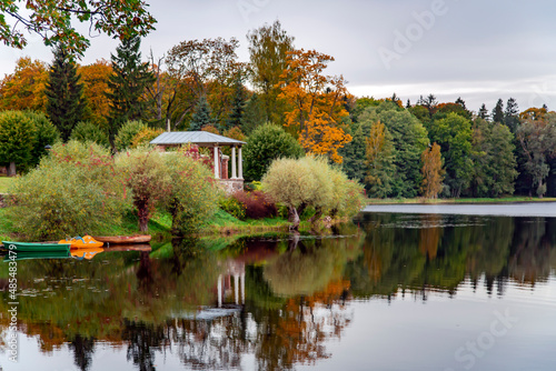Rotunda on the shore of a quiet lake against the backdrop of an autumn foliage forest in Latvia. oncept of a relaxing weekend holiday in nature.