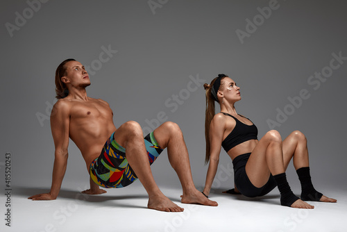 Beautiful young acrobats or gymnasts on gray background. Professional ballet couple dancing, Emotional duet performing choreographic art. Animal instinct
