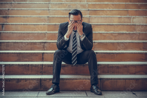 asian man in suit stress and unemployment. thinking alone sitting on stairs.