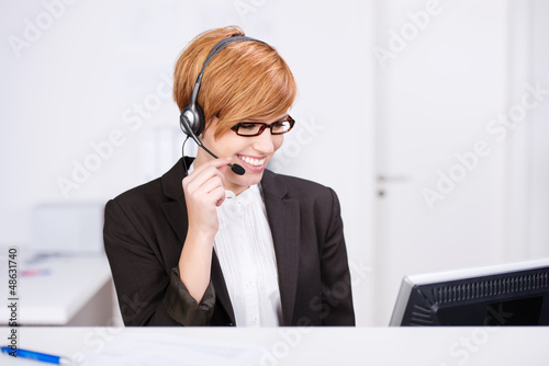 freundliche frau mit headset und computer