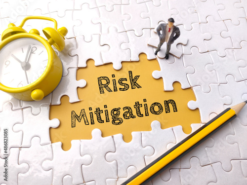 Top view pencil,clock and miniature people with text Risk Mitigation on a white puzzle background.