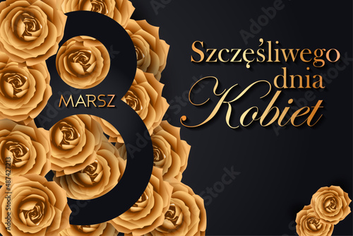 kartka lub baner na Dzień Kobiet 8 marca w kolorze złotym na czarnym tle ze złotymi różami