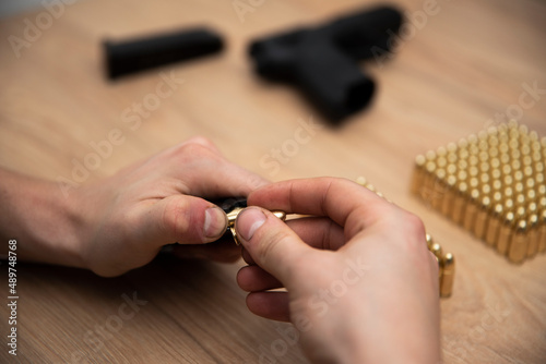 Mężczyzna ładujący amunicję do magazynku. W tle leży pistolet i naboje