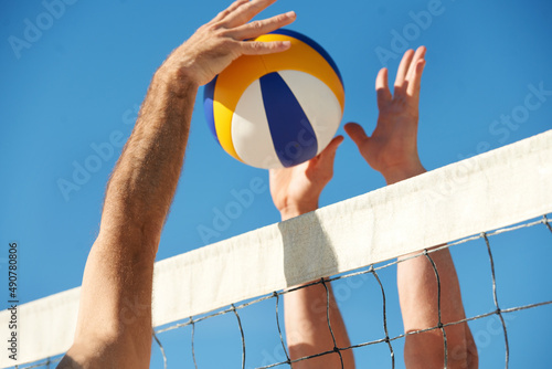 Its anyones point now. Shot of a beach volleyball game on a sunny day.