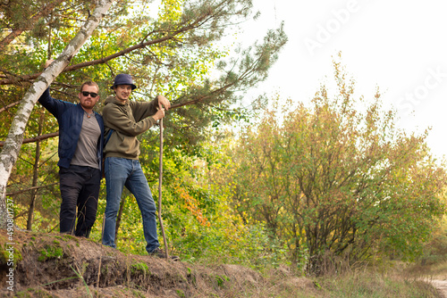 Two happy students hiking in the woods