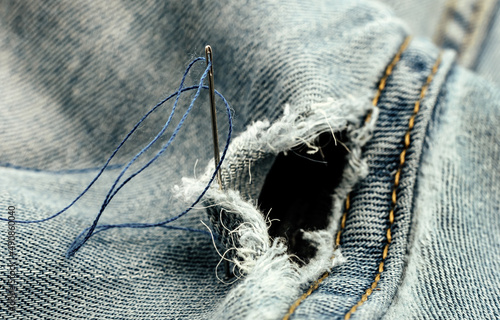 Hole in jeans. Needle with thread for darning jeans. Tools for work dressmaker, seamstress fashion designer