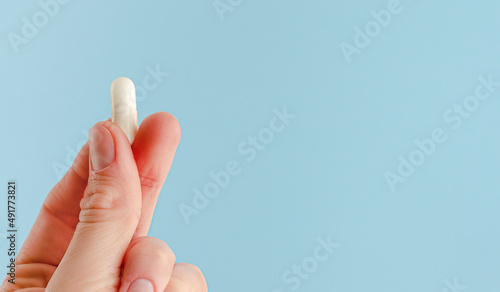 Female hand holding white capsule on blue background. Close, copy space. Pharmacology concept